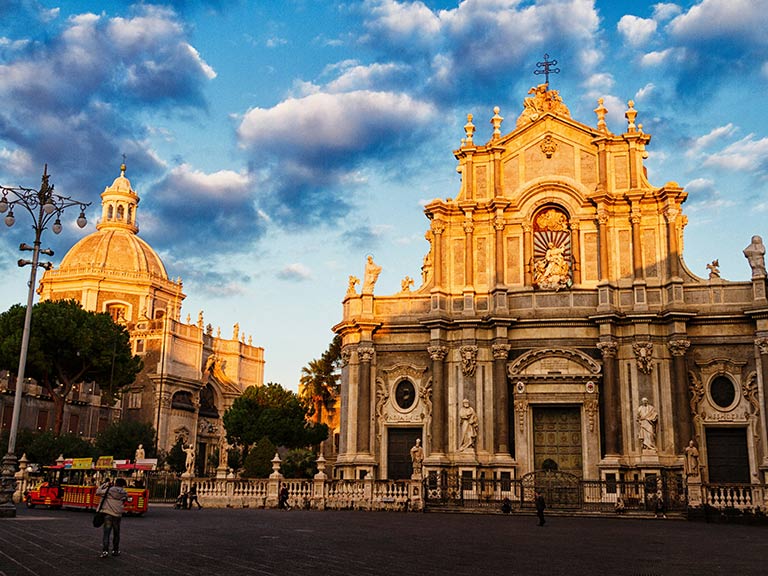Catania, città barocca ai piedi dell’Etna, incanta con la sua vibrante energia e la sua storia millenaria. Il suo cuore pulsante, Piazza del Duomo, è un trionfo di architettura lavica, con la maestosa Cattedrale e la simbolica Fontana dell’Elefante. Il mercato del pesce, “la Pescheria”, è un’esplosione di colori e sapori, mentre le vie del centro storico svelano tesori nascosti, tra palazzi nobiliari e chiese barocche. Catania è un connubio perfetto tra arte, cultura e tradizione, un luogo dove l’anima della Sicilia si manifesta in tutta la sua bellezza